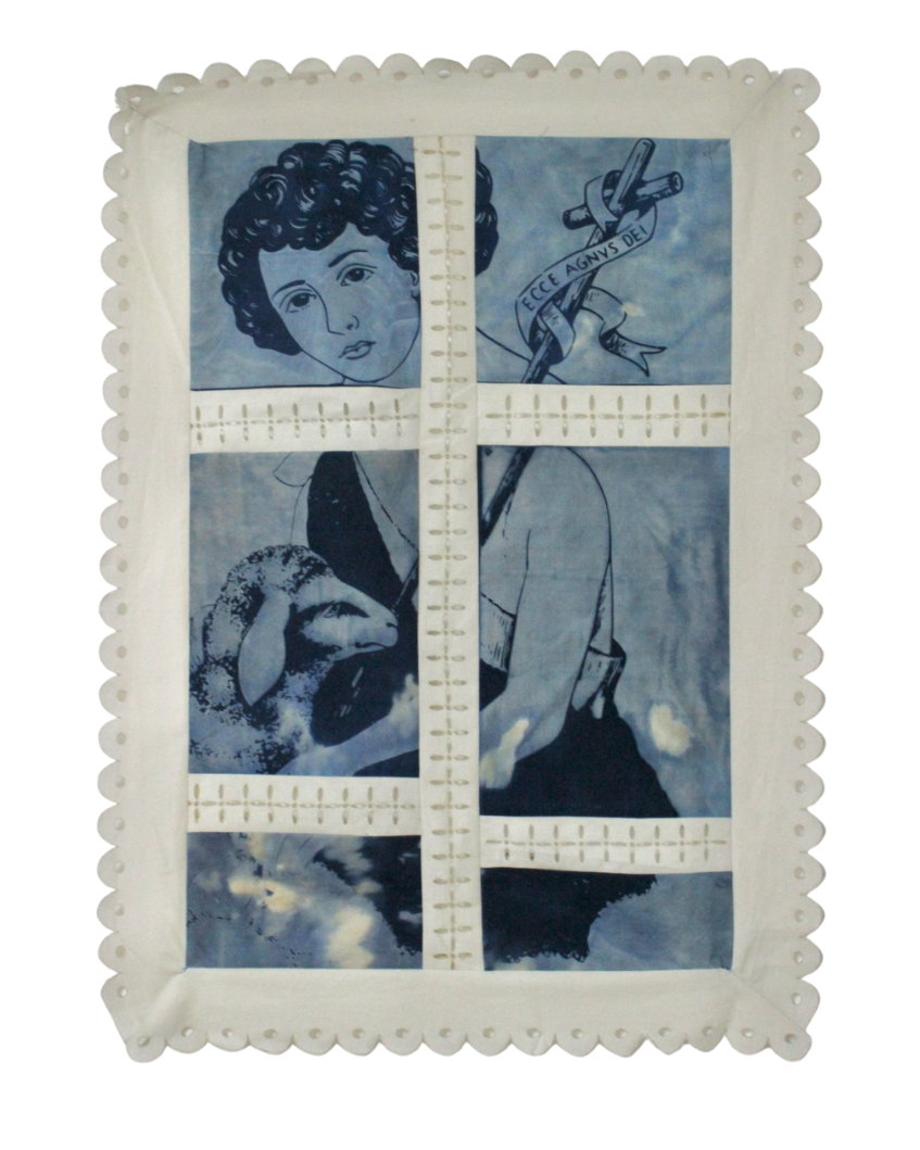 São João is a contemporary textile work that reimagines traditional Portuguese iconography through the layered processes of cyanotype and laser-cut fabric collage. Combining natural printing techniques with precise digital fabrication, the piece bridges the tactile intimacy of folk traditions with the aesthetics of modern technology. Referencing motifs commonly associated with Portuguese cultural celebrations, São João functions as a modern quilt—a visual tapestry that pays homage to heritage while questioning how cultural memory is preserved, transformed, and re-presented in an age of mechanization.