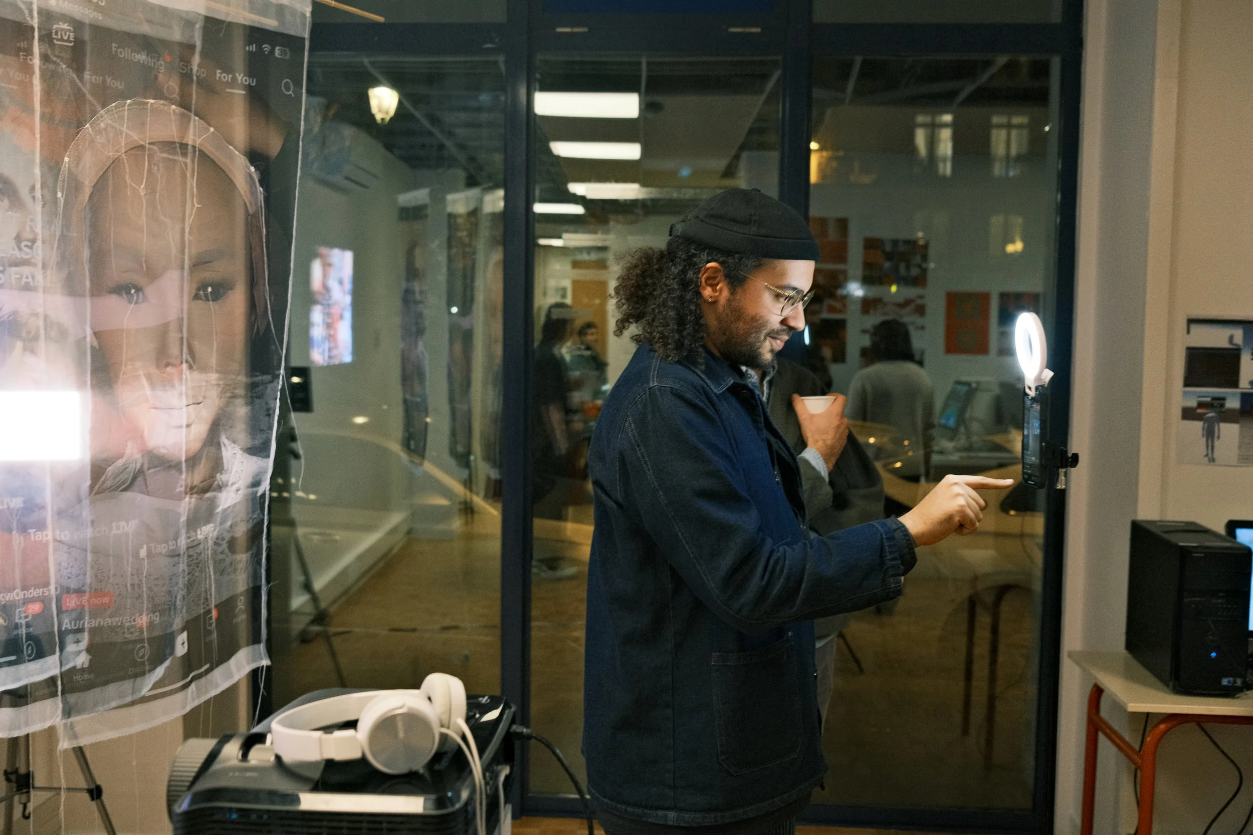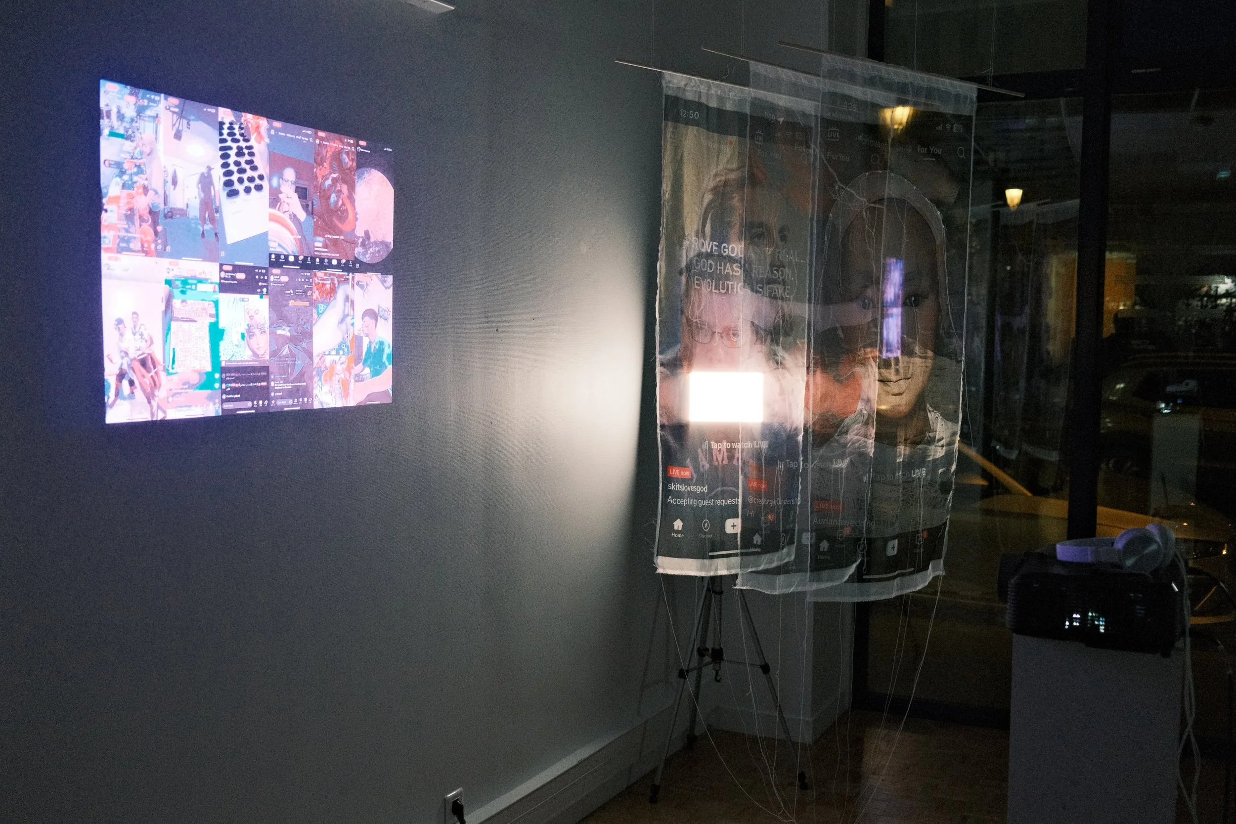 An accompanying video work, built in TouchDesigner, digitally stitches together a constellation of TikTok live feeds — replicating the chaotic, stream-of-consciousness intimacy that defines this corner of the internet.